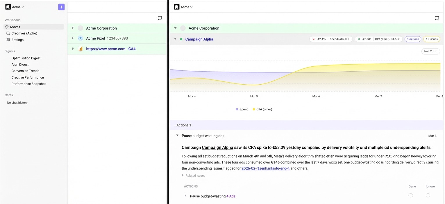 Moves refreshes daily based on your Optimisations schedule. We’re starting with selected issue types (e.g. CPA spikes, underperforming campaigns). Coverage will expand over time.