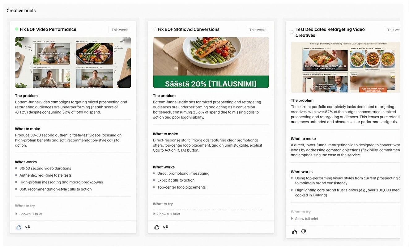 Before, Creatives told you which media perform and which ones don't. Now, it recommends what to produce next. Creative Briefs turns your winners and losers into creative recommendations in a relevant context.